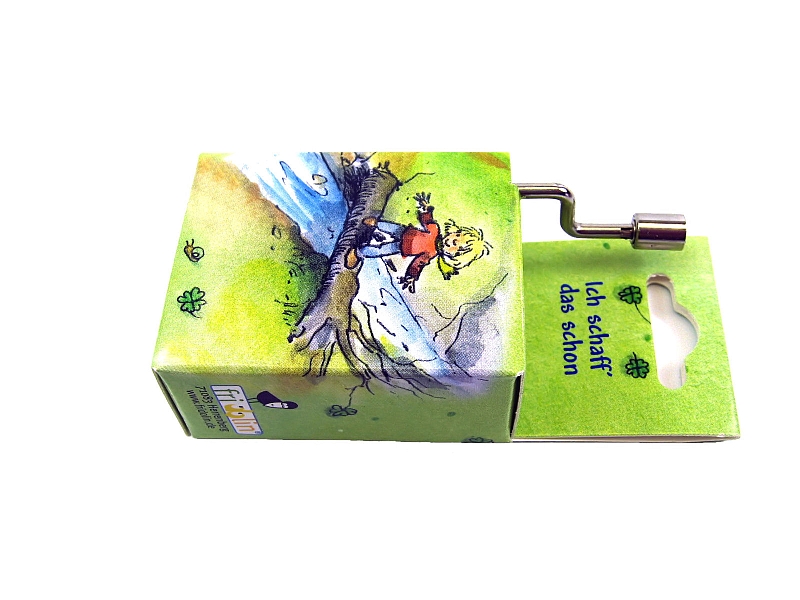 in bunter Pappschachtel mit Aufschrift der Melodie.