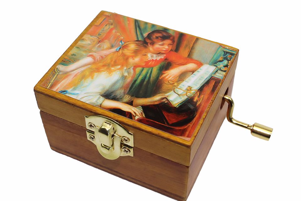 Handkurbelwerk mit 18 Tönen in einer Holzschachtel.