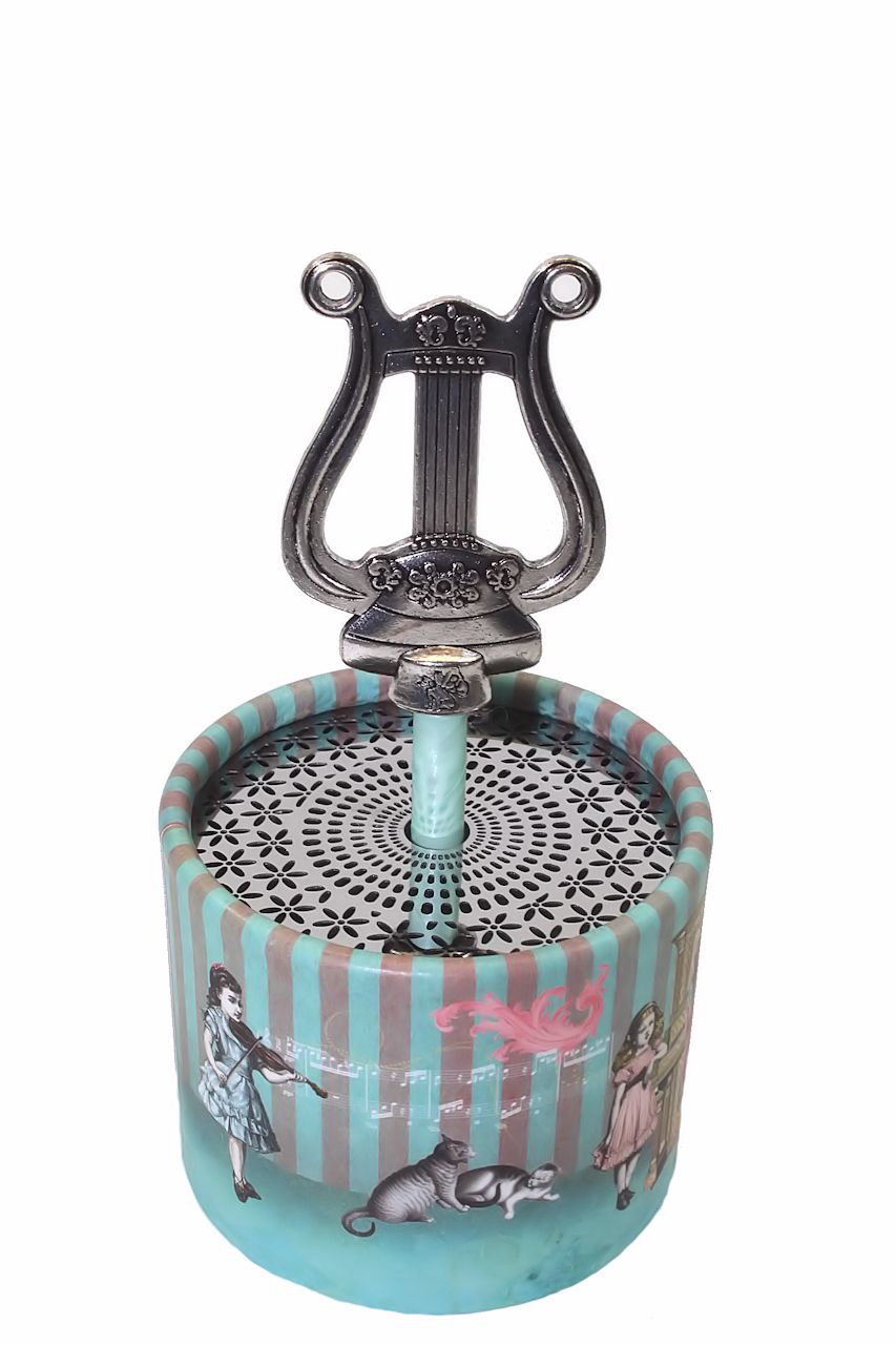 Hübsche Spieldose aus Papier und durchbrochenem Metall.